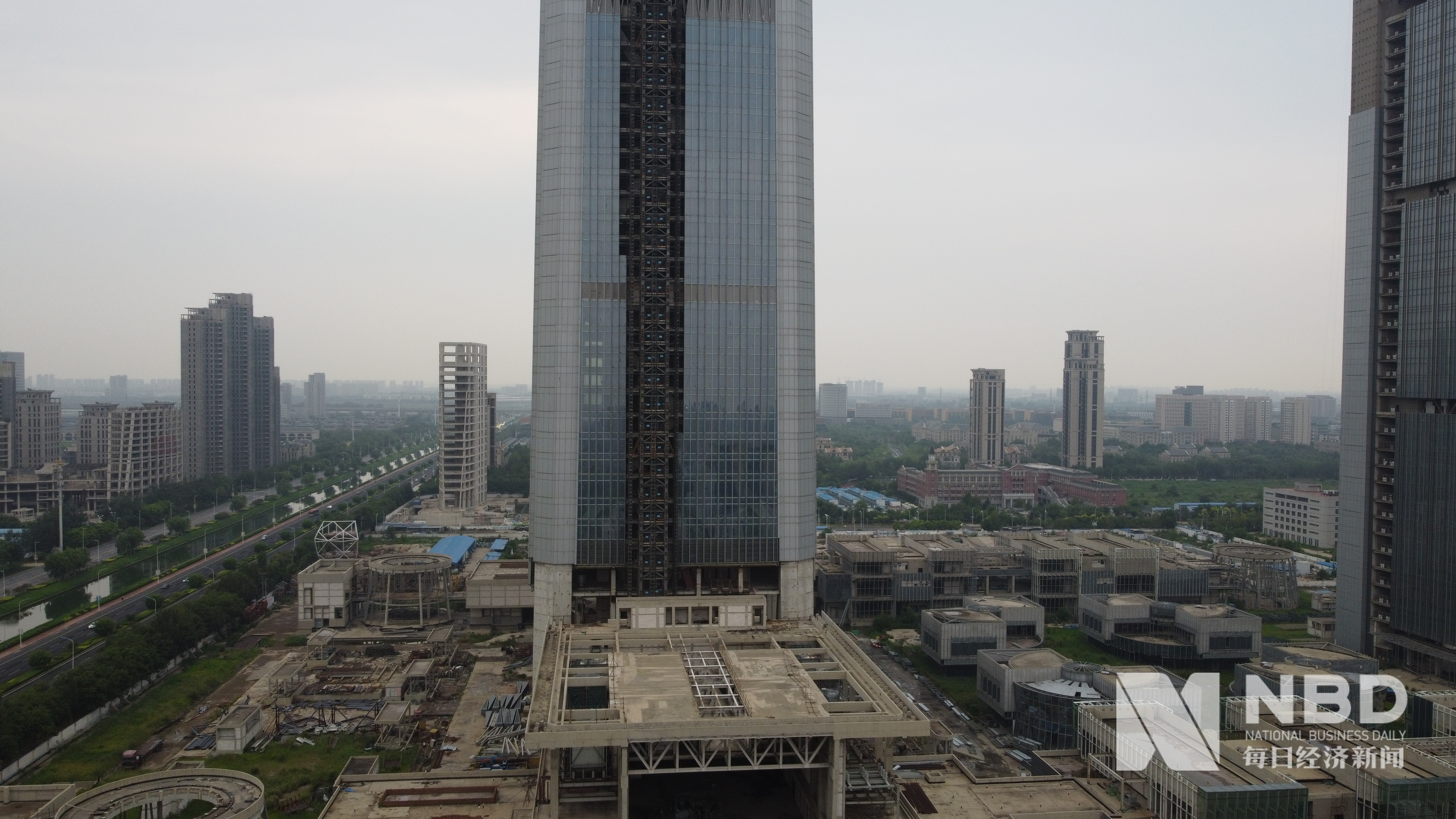 通过无人机镜头俯瞰,项目现场到处是散落的建材,部分区域已经长满了杂草,与周边环境格格不入。不过,即便大厦没有施工迹象,但承建方中建三局的项目部还在,临时活动板房和招牌都是崭新的,项目现场“生人勿进”。有值守的工作人员告诉《每日经济新闻》记者,“去年施工了一段时间,但没多久又停了,现在也一直停工。项目还是有人,大家还上班呢。”