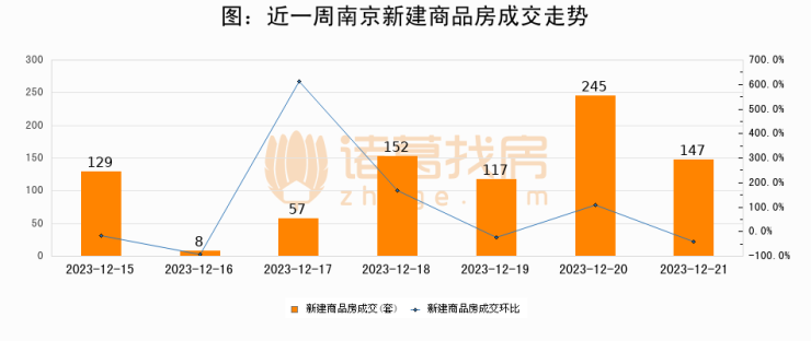 根据南京市住房保障和房产局数据显示,2023年12月21日南京新建商品房成交147套,较昨日减少98套,环比下降40%