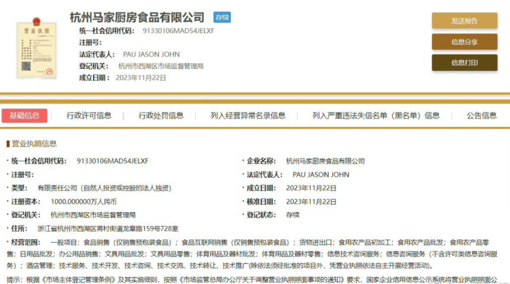 国家企业信用信息公示系统网站显示,11月22日,杭州马家厨房食品有限公司成立,法定代表人为PAU JASON JOHN,注册资本1000万人民币,经营范围含食品销售(仅销售预包装食品)、货物进出口、食用农产品批发、日用品批发、酒店管理、技术服务等。