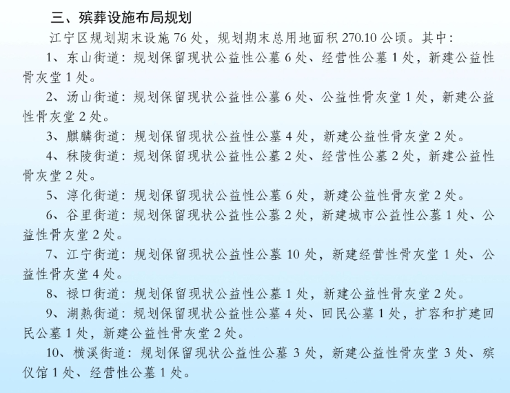 其中江宁殡仪馆目前所在的东山街道,规划保留现状公益性公墓6处、经营性公墓1处,新建公益性骨灰堂1处。