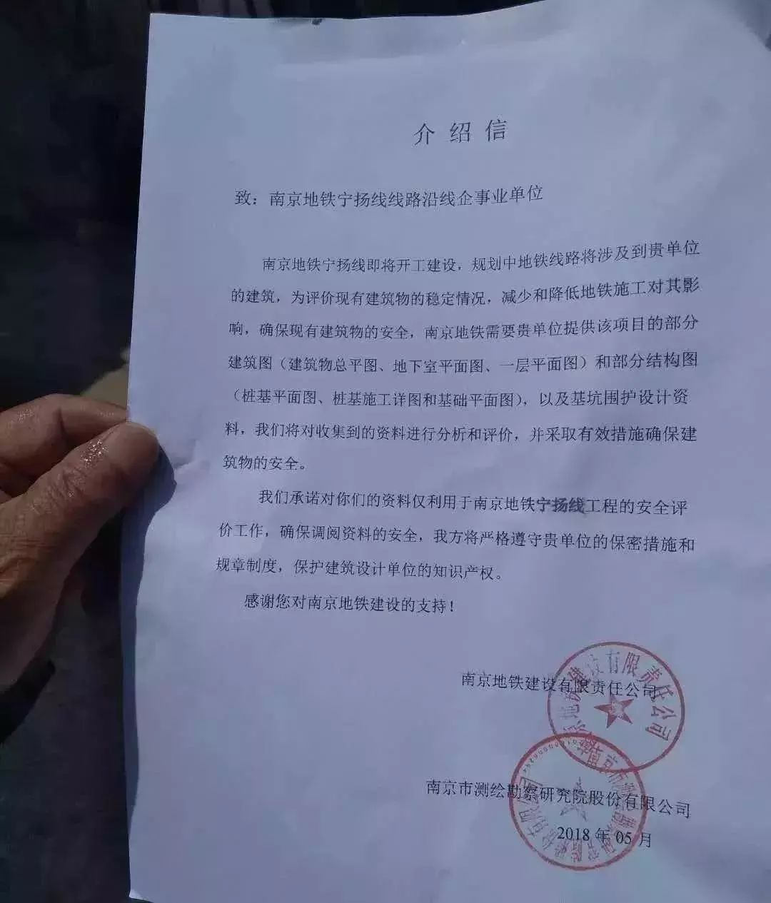同样是5月,南京地铁建设有限责任公司和南京市策划勘察研究院股份有限公司向宁扬线线路沿线企事业单位发出了介绍信。宁扬城际开工在即。