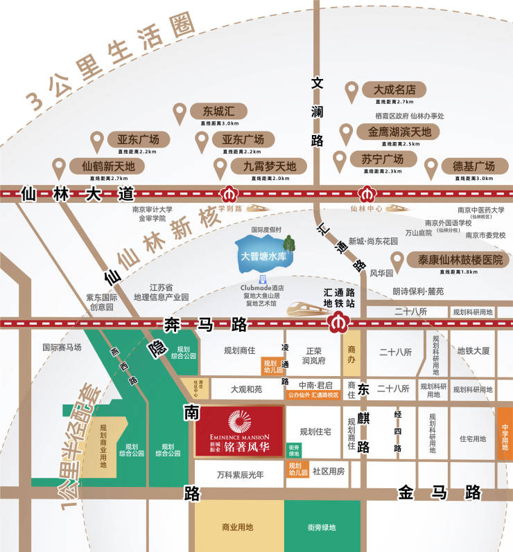 铭著风华,直距约700米即达地铁4号线汇通路站,另外2号线与规划中的12号线/8号线纵横环伺,4站瞬达仙林中心繁华商圈,热点板块基因令人艳羡!醇熟都市生活圈内,汇聚九霄梦天地、东城汇和金鹰湖滨天地/金鹰奥莱城齐聚,在建苏宁广场和规划中的仙林德基广场,更有泰康仙林鼓楼医院、江苏省中医院仙林分院(在建)等,三甲医疗资源健康护航。