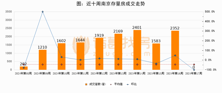 存量房方面,第16周南京存量房成交0套,较上周减少2352套,环比下降100%。从近十周成交走势来看,周均成交套数为1508套,本周低于平均水平100%。