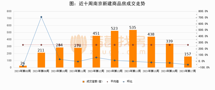 进入2024年第16周(04月15日-04月21日),南京新建商品房成交157套,较上周减少182套,环比下降53.7%