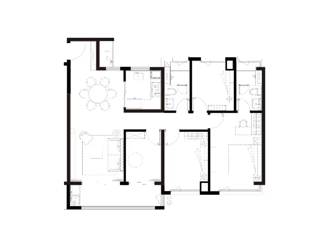 120㎡户型为四房两厅两卫,四开间朝南,尺度更奢阔,采光更好,并且户型主体为动静分区,更加注重舒适度。