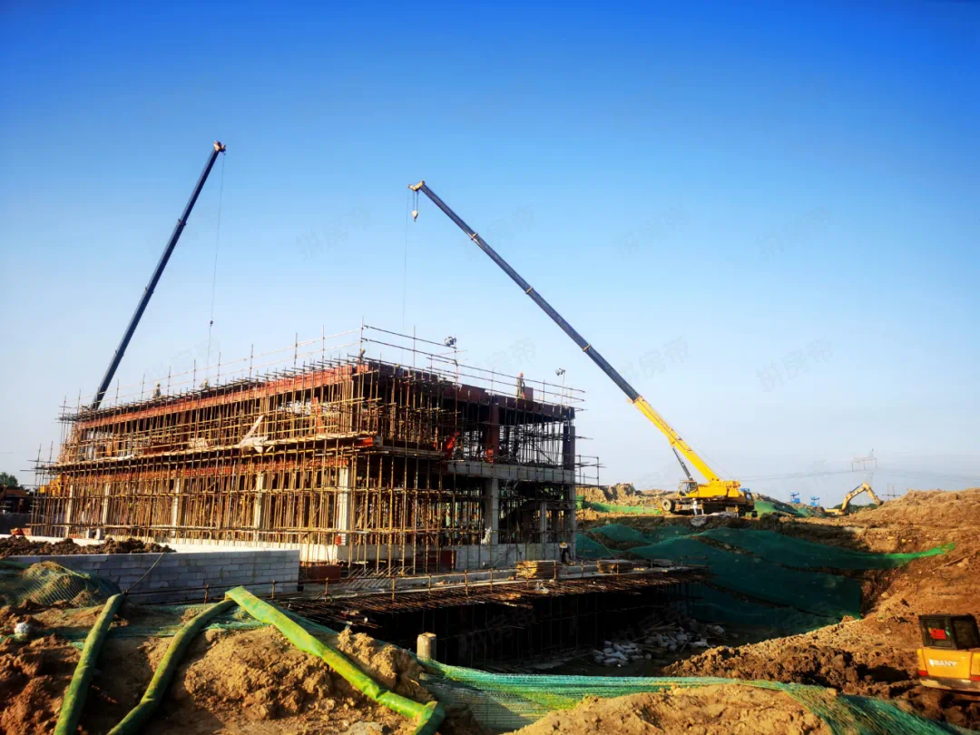 继续走进,现场可以看到一些挖机,由于地块内有不少小土坡,预计接下来的土方作业工程量较大。售楼处位于地块西侧,现场可以看到一层已经完成主体建设,一些工人正在进行二层的钢筋及模板搭建,预计很快就可以完成水泥浇灌。
