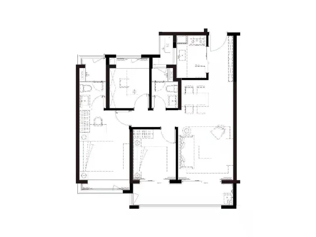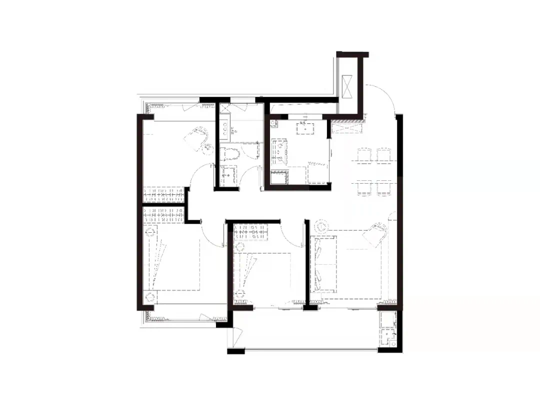 100㎡户型为三室两卫,和89㎡户型功能区分布基本一致,主卧套房设计,私密性更强。餐客厅一体化设计;厨房L型设计。
