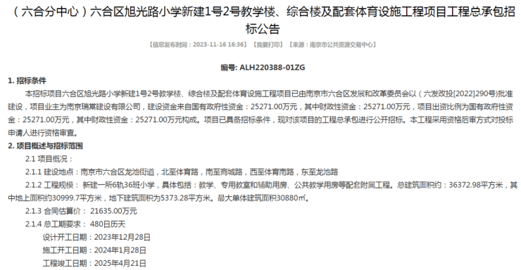 近日,南京市公共资源交易平台发布最新公告,六合区旭光路小学新建项目正式提上日程!