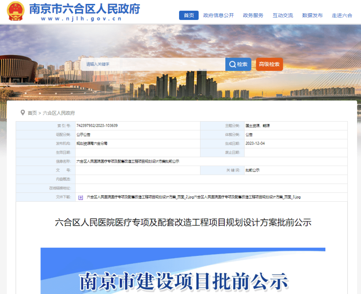 近日,六合区人民政府网站发布了六合区人民医院医疗专项及配套改造工程项目规划设计方案批前公示。