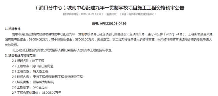 近日,(浦口分中心)城南中心配建九年一贯制学校项目施工工程资格预审公告出炉,万众瞩目的城南中心九年一贯制学校终于要来了!