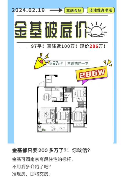 河西南岸的金基,直降近100万,97平房源一口价286万,折合单价2.9万/平。