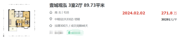 而此前壹城观泓作为共有产权房,前后三次开盘,总共超万人摇号,当时毛坯均价约32062元/㎡,这套成交的房源比当时很多人的买入价还低了约2000元/㎡。