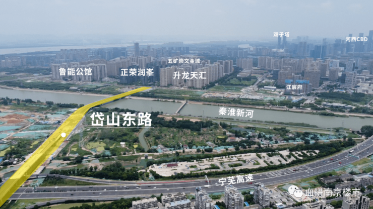 金基雅玥距离河西南有多近?我们从航拍看的更为清楚,仅一条秦淮新河的距离。用地图测距,直线距离也不过1公里。
