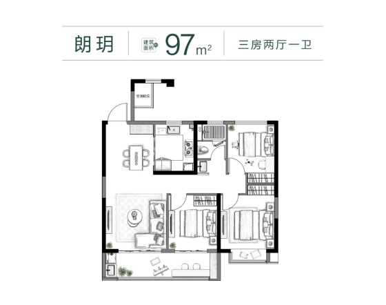 建面约97㎡户型做的是3房2厅1卫的设计。之所以没有做市面上的两卫设计,是为公共区域和次卧留下了更多的空间,其实对比来看,这个户型面积段做1卫住起来会更为舒适。