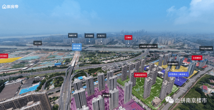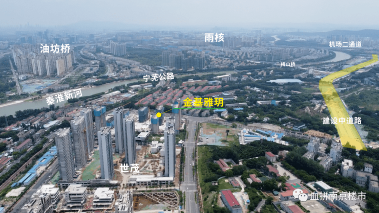 金基雅玥距离河西南有多近?我们从航拍看的更为清楚,仅一条秦淮新河的距离。用地图测距,直线距离也不过1公里。