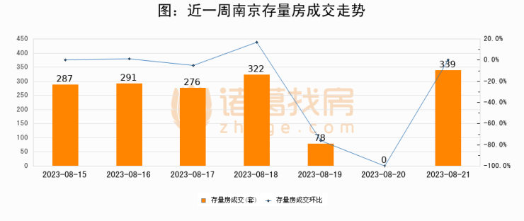 从存量房来看,2023年08月21日南京存量房单日成交339套,比昨日增加339套,环比上涨0%。从近一周存量房成交来看,南京存量房日均成交套数为227套,08月21日单日成交339套,高于近一周平均水平49.3%。