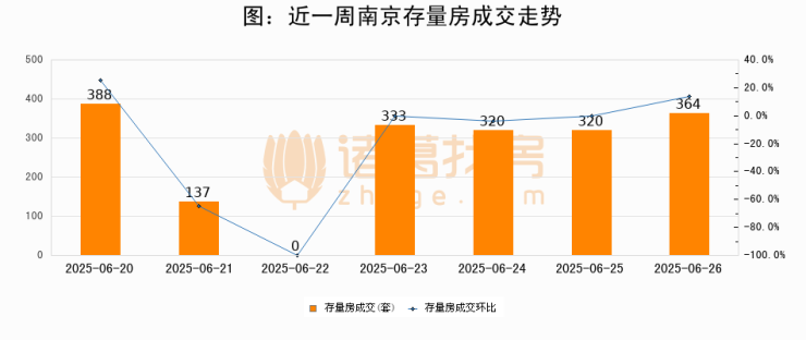 从存量房来看,2025年06月26日南京存量房单日成交364套,比昨日增加44套,环比上涨13.8%。从近一周存量房成交来看,南京存量房日均成交套数为266套,06月26日单日成交364套,高于近一周平均水平36.8%。
