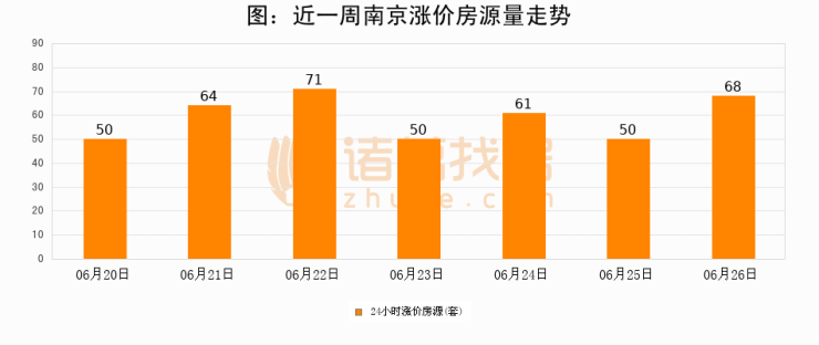 根据诸葛找房数据显示,南京24小时涨价房源量为68套,较06月25日增加18套,环比上涨36%。与此同时,涨价房源占比小幅扩大,业主信心有所提升。