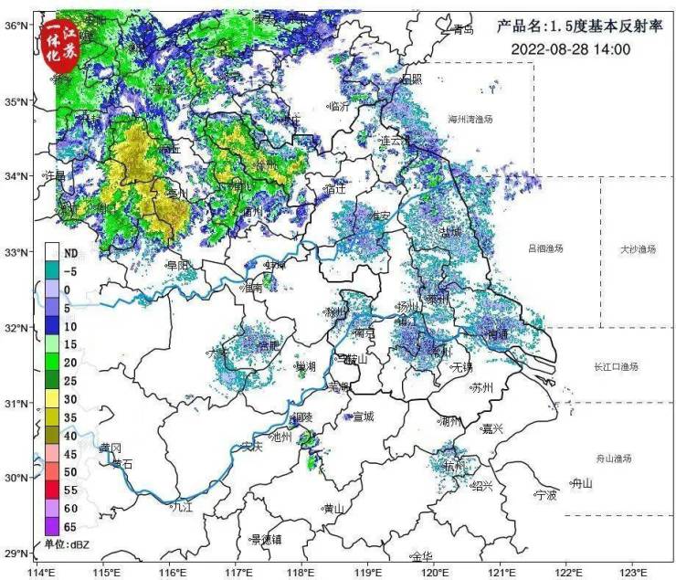 8月28日 沿淮和淮北地区阴有阵雨或雷雨,雨量中等,局部大雨,其他地区多云到阴。