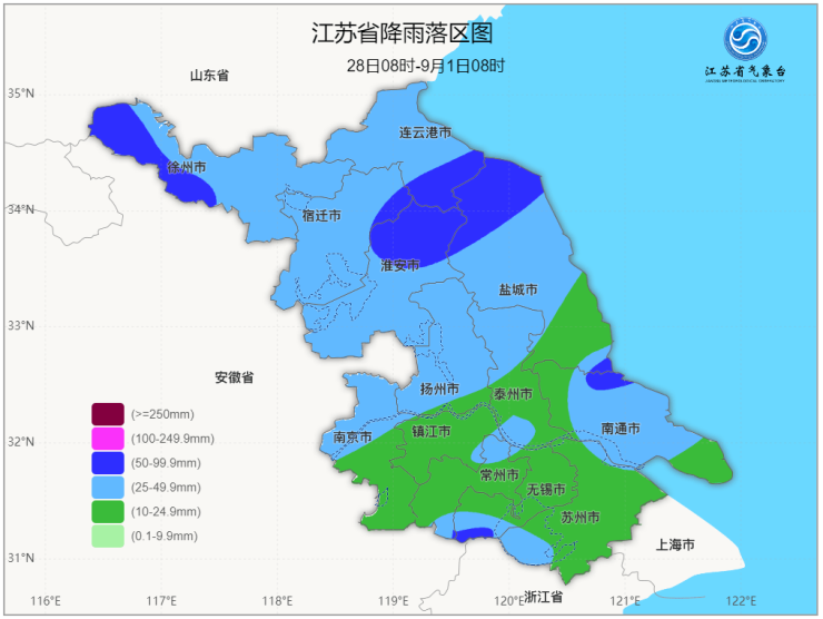 受低涡切变线影响,8月28-30日江苏省自北向南有一次较强降水过程,局部地区将伴有短时强降水,8月29-30日淮河以南局部地区可能伴有8~9级雷暴大风。8月31日淮河以南地区阴有阵雨并渐止。预计8月28日08时-9月1日08时累计雨量:江淮之间北部和淮北地区30~50毫米,部分地区60~90毫米;其他地区10~30毫米,局部50~80毫米。