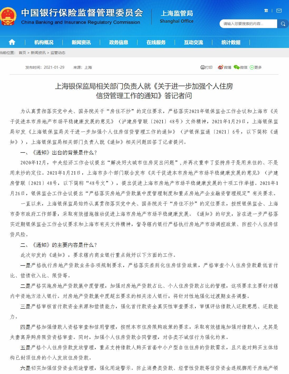 今年1月29日,上海银保监局印发《上海银保监局关于进一步加强个人住房信贷管理工作的通知》(以下简称《通知》),要求上海各家银行“对2020年6月份以来发放的消费类贷款、经营性贷款以及个人住房贷款进行全面自查”“防止信贷资金违规挪用于房地产领域,防范借款人或受托支付对象规避用途管理”“借款人存在违反合同约定行为的,按照合同约定给予惩戒”。