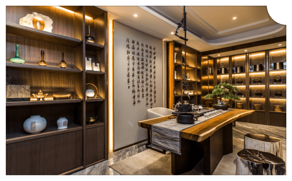 楼下茶室,清雅禅意的空间。开辟一间茶室,闲来对坐、蒲团上,品一杯清茶,在悠长的茶韵中放下心中的纷扰,品味恬淡优雅的生活滋味。