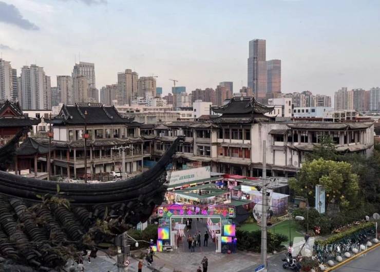 沿方浜中路到城隍庙门口,周围游客络绎不绝,民俗传统特色的灯光流光溢彩。大门正南面却是一整排尚未完工的仿古式建筑群,有的屋顶布满灰尘,窗户上的钢材还未拆除,院子里留着成堆的建筑垃圾,与周遭格格不入。