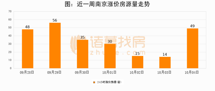根据诸葛找房数据显示,南京24小时涨价房源量为49套,较10月03日增加35套,环比上涨250%。与此同时,涨价房源占比小幅扩大,业主信心有所提升。