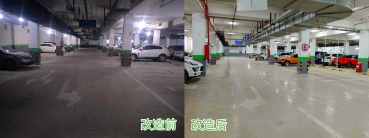 史磊提到,小区地库原为起砂地面,墙面斑驳、照明缺失、清扫困难,车辆常年积灰,有业主戏称小区地库是检测车辆底盘和减震还有大灯的的测试场。于是,在街道、社区、业委会、物业的共同努力下,万科物业决定从最难的、最复杂、最能看到改变的地库改造做起。进行14000平方的地面固化改造。