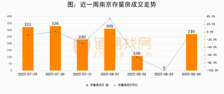 从存量房来看,2025年08月04日南京存量房单日成交270套,比昨日增加270套,环比上涨0%。从近一周存量房成交来看,南京存量房日均成交套数为223套,08月04日单日成交270套,高于近一周平均水平21.1%。