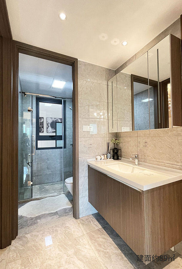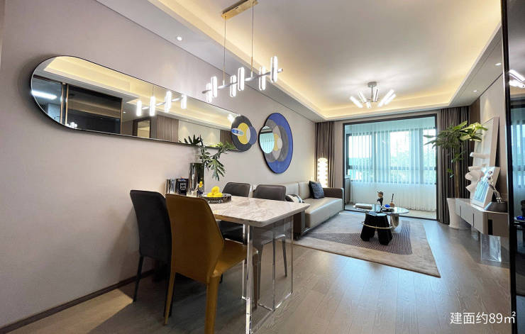 89平米三房户型,客餐厅一体布局,配上约5米的观景阳台,还打造了270度转角设计。