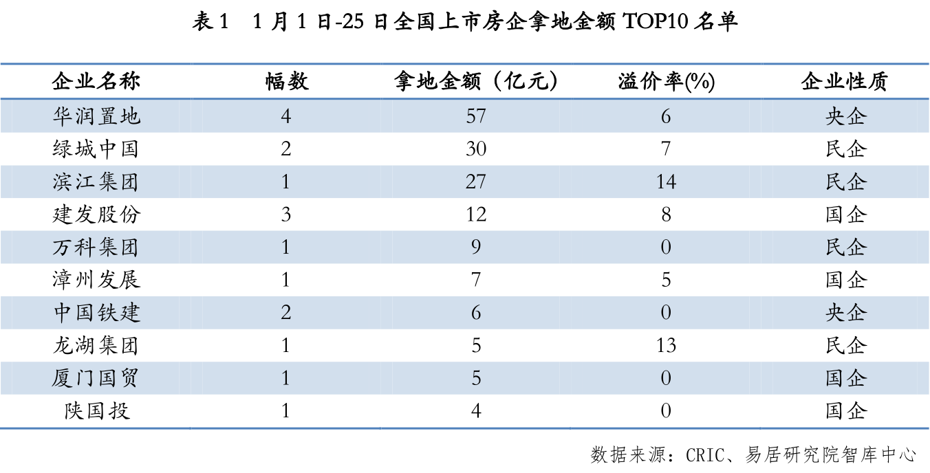 这从各房企拿地溢价率上不难发现。1月份滨江和龙湖各自拿下的1宗宅地,溢价率分别高达14%和13%,其余国资企业拿地溢价率都普遍较低,有不少属于兜底性质,像中国铁建、厦门国贸、陕国投等地块都是底价获取。
