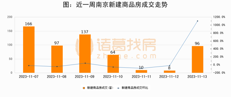 根据南京市住房保障和房产局数据显示,2023年11月13日南京新建商品房成交96套,较昨日增加88套,环比上涨1100%