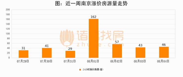 根据诸葛找房数据显示,南京24小时涨价房源量为46套,较08月03日增加3套,环比上涨7%。与此同时,涨价房源占比小幅扩大,业主信心有所提升。