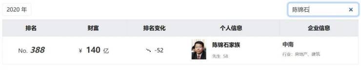 随着中南集团的发展,陈锦石的身家也水涨船高,2008年就登上了《胡润百富榜》,2020年他以140亿元的身家排名第388。