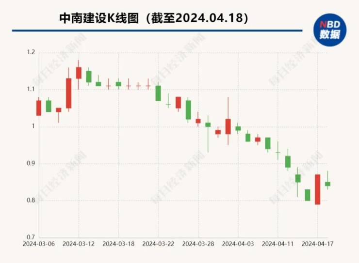 然而好景不长,4月18日,中南建设股价再次下跌3.45%,股价报收0.84元,总市值仅剩32.14亿元。