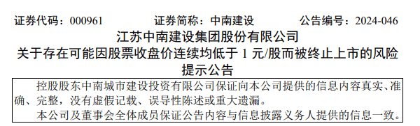 4月18日,中南建设发布关于存在可能因股票收盘价连续均低于1元/股而被终止上市的风险提示公告。