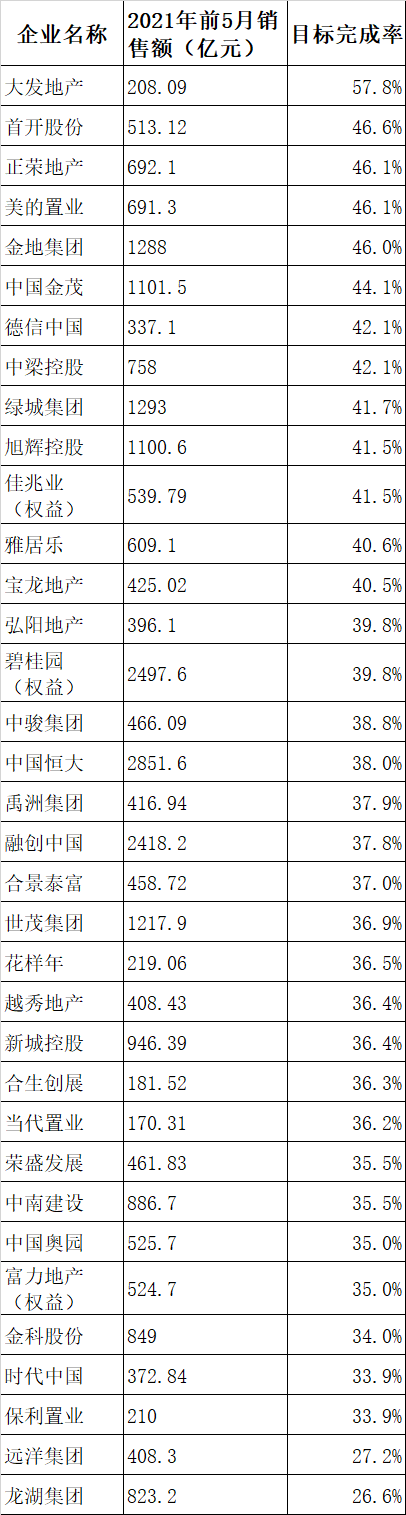 2021年1-5月份部分房企销售额及年度目标完成率概况
