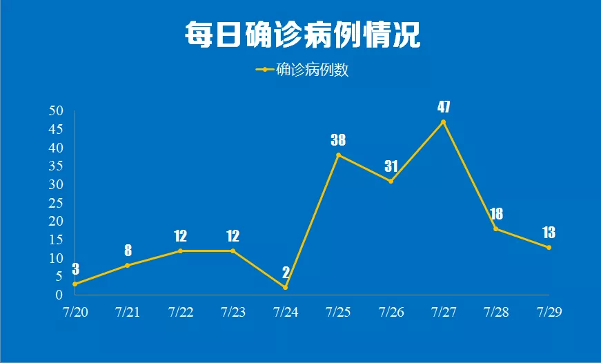 根据省卫健委7月30日发布,2021年7月29日0-24时,我市新增新型冠状病毒肺炎本土确诊病例13例(其中含1例无症状感染者转确诊),无新增无症状感染者;新增本土确诊病例中,轻型10例、普通型3例。有1例确诊病例由普通型转为重型,6例由轻型转为普通型。