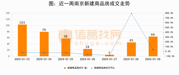 根据南京市住房保障和房产局数据显示,2024年01月29日南京新建商品房成交64套,较昨日增加19套,环比上涨42.2%