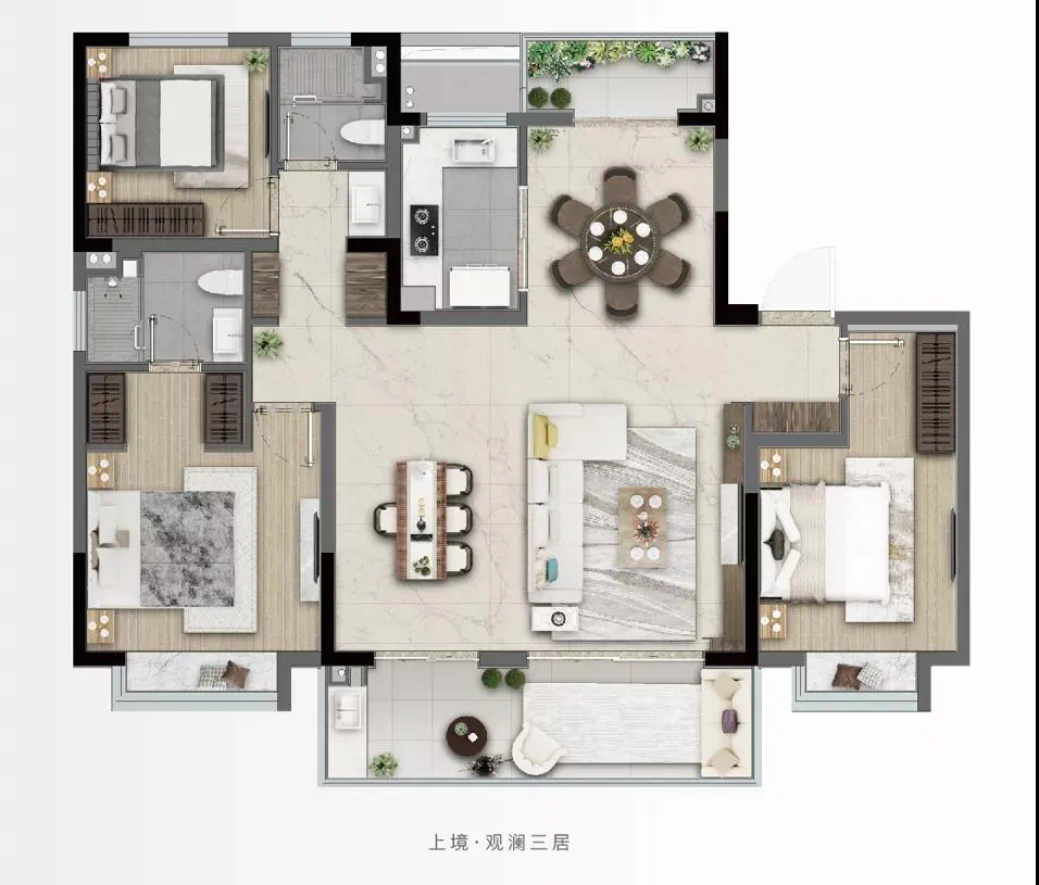 南向大面宽景观阳台延伸客厅空间视觉,长6.4m,进深达到1.8m。配置好太太品牌电动晾衣架,还可以加装家政柜,放置洗衣机与烘干机。当然观景也很重要,阳光午后邀请好友一起在此品茗赏景岂不惬意?