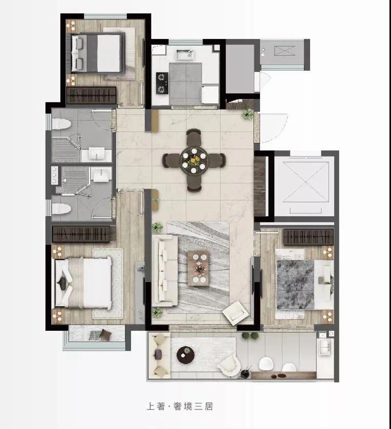 建面115㎡三室两厅两卫C1户型:主卧套间设计,三开间朝南,双阳台采光通风更佳!