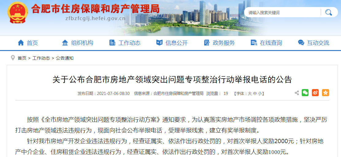 据合肥市住房保障和房产管理局网站消息,刚刚,合肥市房地产领域突出问题专项整治行动领导小组办公室发布关于公布合肥市房地产领域突出问题专项整治行动举报电话的公告。 按照《全市房地产领域突出问题专项整治行动方案》通知要求,为认真落实房地产市场调控各项政策措施,坚决严厉打击房地产领域违法违规行为,现面向社会