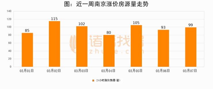 根据诸葛找房数据显示,南京24小时涨价房源量为99套,较03月06日增加6套,环比上涨6.5%。与此同时,涨价房源占比小幅扩大,业主信心有所提升。