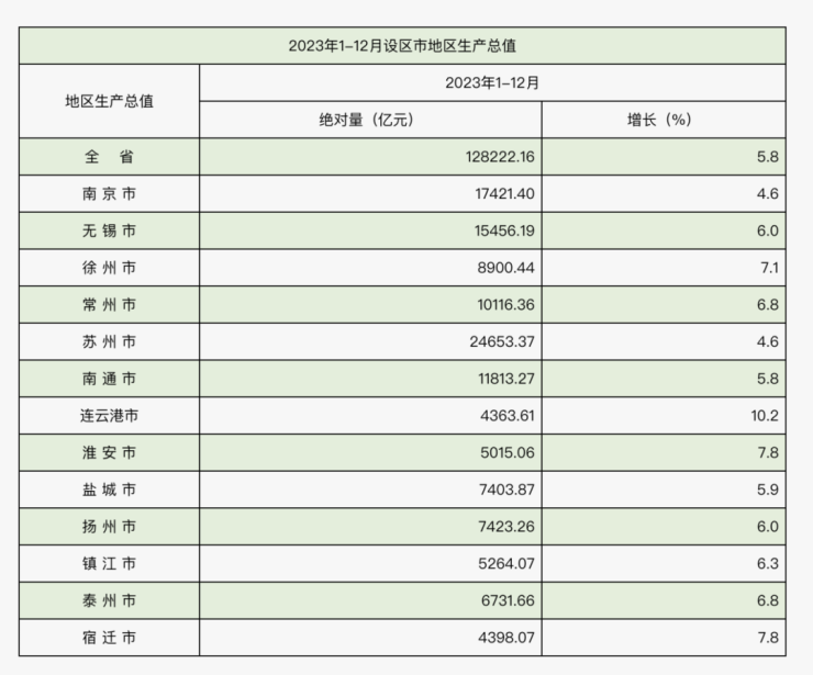 2023年江苏GDP实现128222.16亿,同比增长5.8%。13市中,排名第一的是苏州,南京位列第二,增速第一的是连云港10.2%。