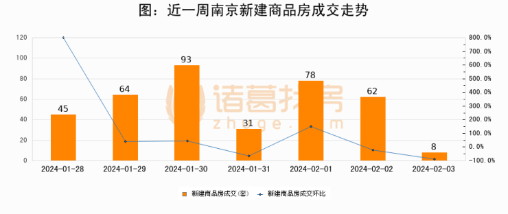 根据南京市住房保障和房产局数据显示,2024年02月03日南京新建商品房成交8套,较昨日减少54套,环比下降87.1%