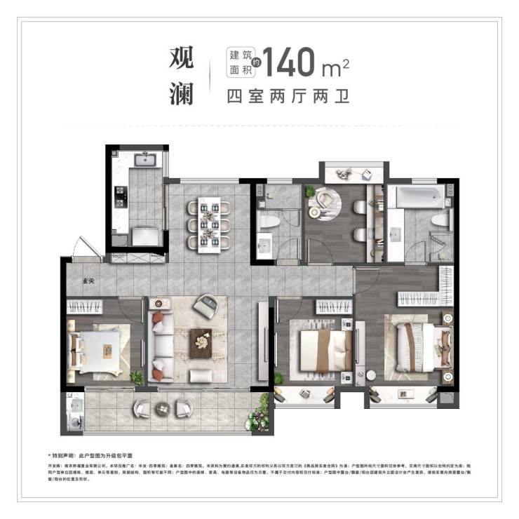 约140㎡四房两卫,全能大四房格局,板块少有,私享主卧套房,自带卫浴、步入式衣帽间,轻松划定精致领地,礼颂优雅生活。约14m南向阔尺开间,跑道式双阳台,大尺度观景视野,更得阳光宠爱,奢阔超乎想象。
