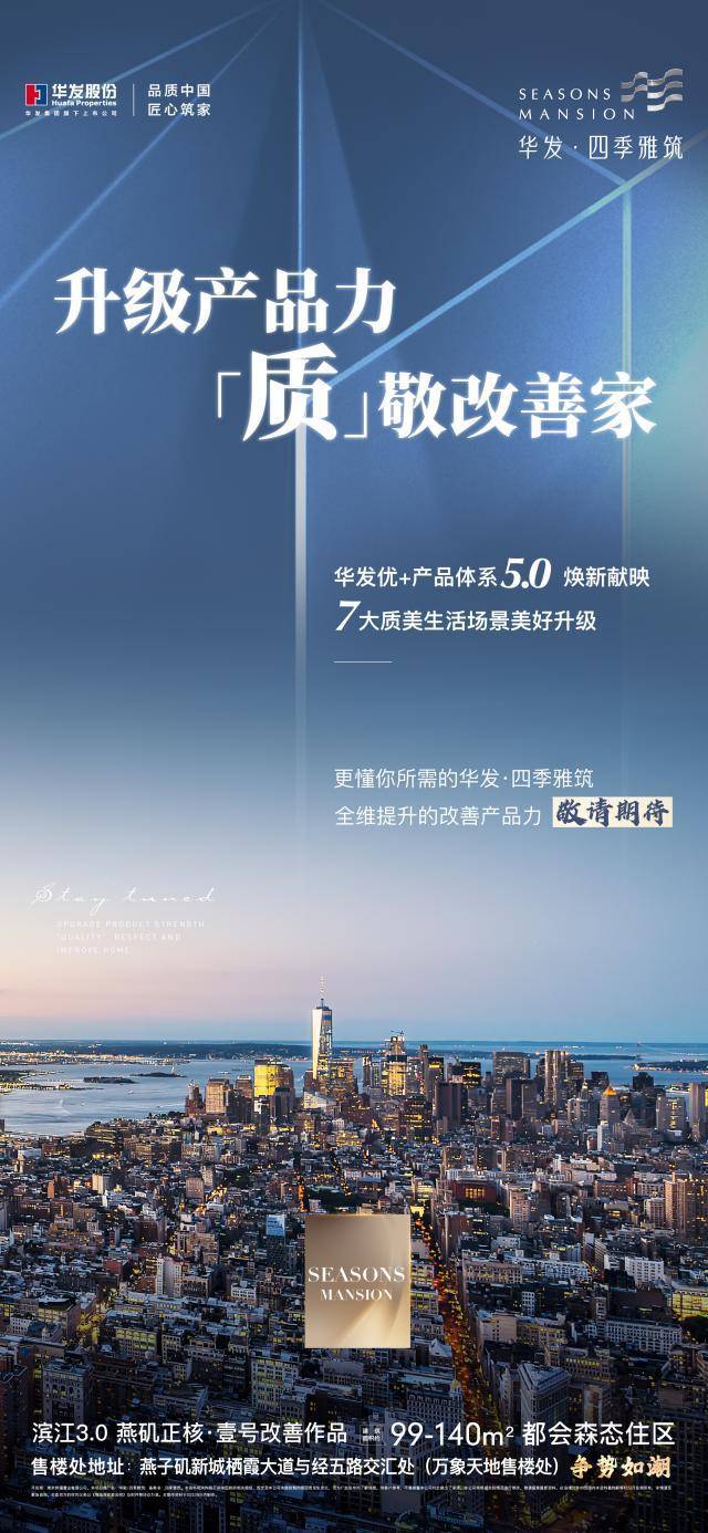 华发股份直击一线、二线城市人居潜在需求,深研市场内部同质化产品差异性,着力焕新住家品质。华发·四季雅筑,紧追华发优+产品体系迭代升级的脚步,提质居住核心价值,为南京高端改善重新赋能。以5.0“三力十二优”为价值基底焕新发布,着力构筑四季雅筑特有的七大质美生活场景,为业主描摹美好生活崭新蓝图,赋新改善标杆。以配套力、产品力、服务力的多项优势,搭建四季雅筑领跑城北楼市的核心竞争力。