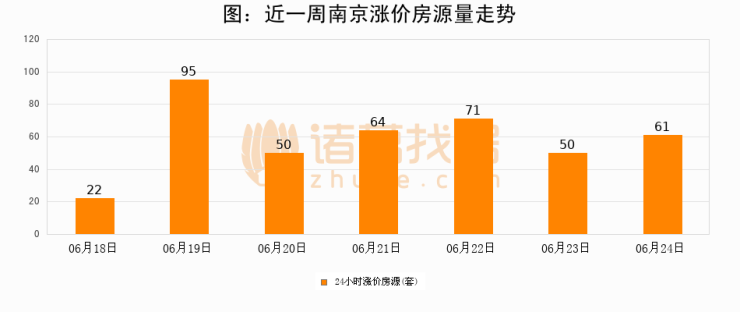 根据诸葛找房数据显示,南京24小时涨价房源量为61套,较06月23日增加11套,环比上涨22%。与此同时,涨价房源占比小幅扩大,业主信心有所提升。