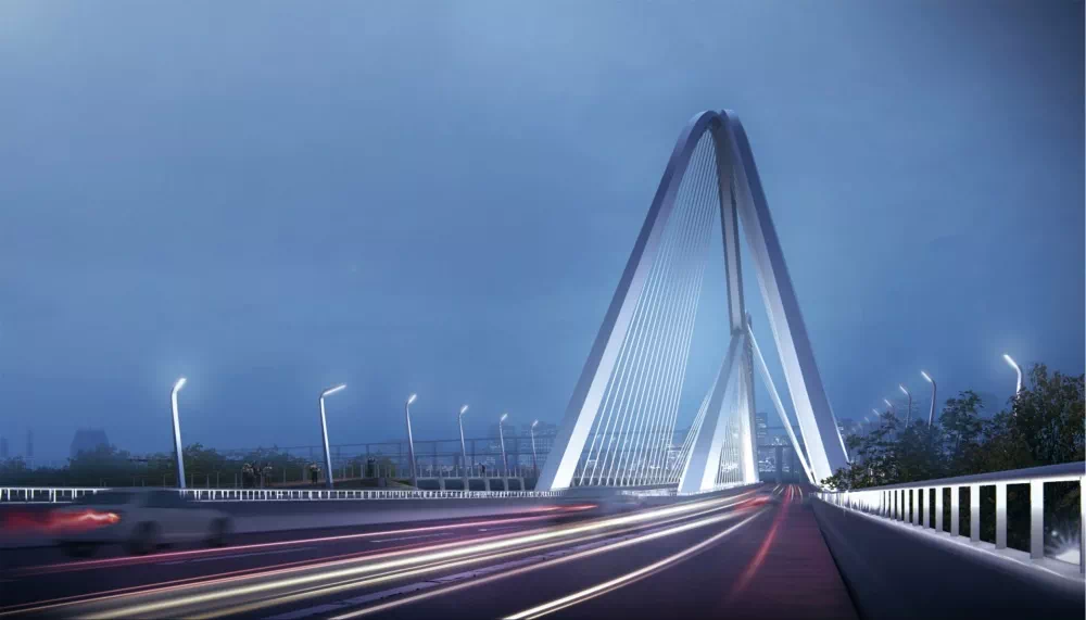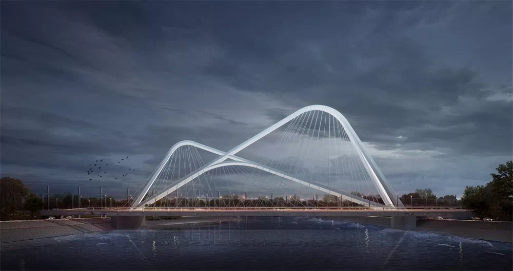 承天大道跨外秦淮河大桥总体构思采用如画山水的设计理念,巧妙结合南部新城位居“将军山”“方山”“青龙山”“紫金山”四座山峦的中央地理位置,四山的剪影交汇于此,形成桥的主体结构,流动的线条漂浮于秦淮河上,远远望去,如画山水。大桥的四个三角拱象征汇聚的四座山,赋予了承天大桥稳定的结构和充满张力的形象。大桥的轮廓延续了南部新城完整而跃动的城市天际线,为城市景观增添新高潮。峰峦叠嶂如描南部新城之崛起,秦淮一湾,如绘南部新城之包容。